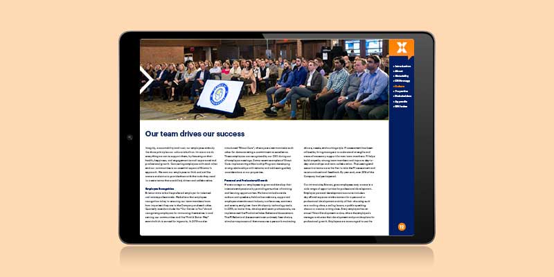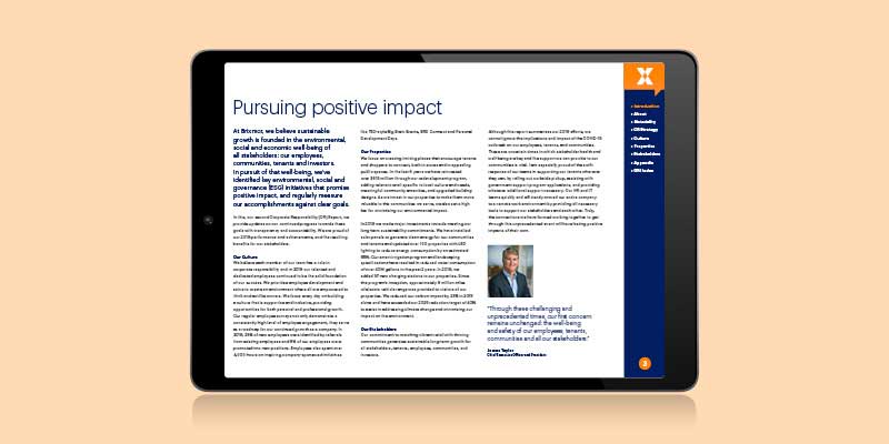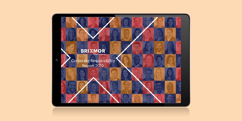 Voor Brixmor heb ik een Corporate Responsibility Report ontworpen, met alles dat ze moeten communiceren volgens de richtlijnen van GRESB (Global Real Estate Sustainability Benchmark). Het is ontworpen volgens de huisstijlrichtlijnen van het Amerikaanse bedrijf.