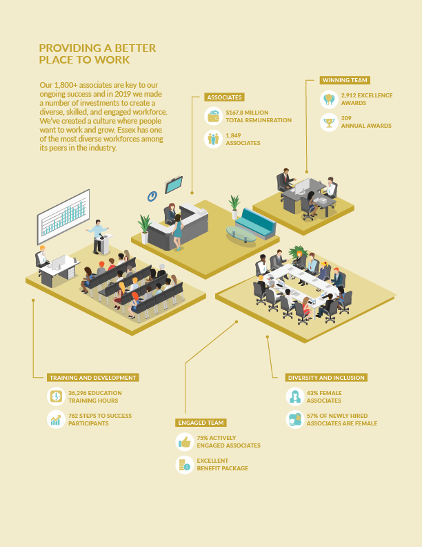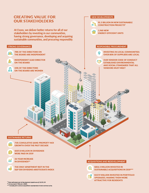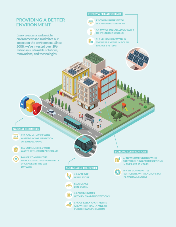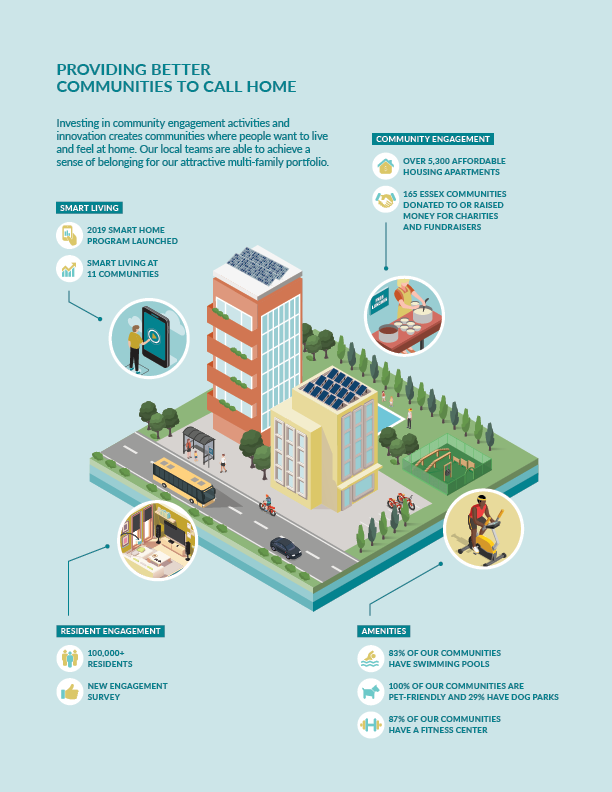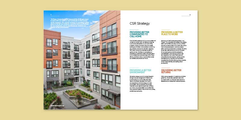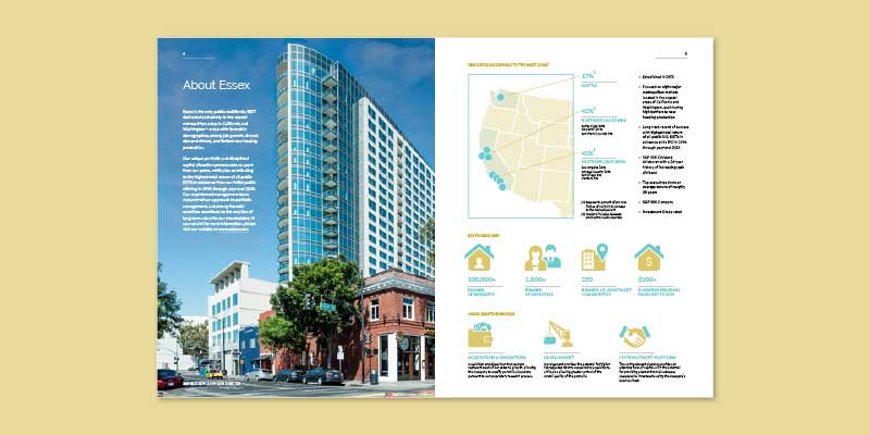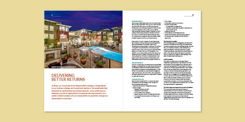 Essex is een vastgoedorganisatie die appartementen(complexen) koopt, ontwikkelt, herontwikkelt en beheert. Het bedrijf richt zich op de metropolitaanse kustgebieden in Californië en Washington van de Verenigde Staten. Deze gebieden hebben een gunstige demografie, sterke banengroei en een beperkte productie van nieuwe woningen. In het Corporate Responsibility Report dat ik heb ontworpen, wordt gecommuniceerd hoe het zit op het gebied van duurzaamheid.