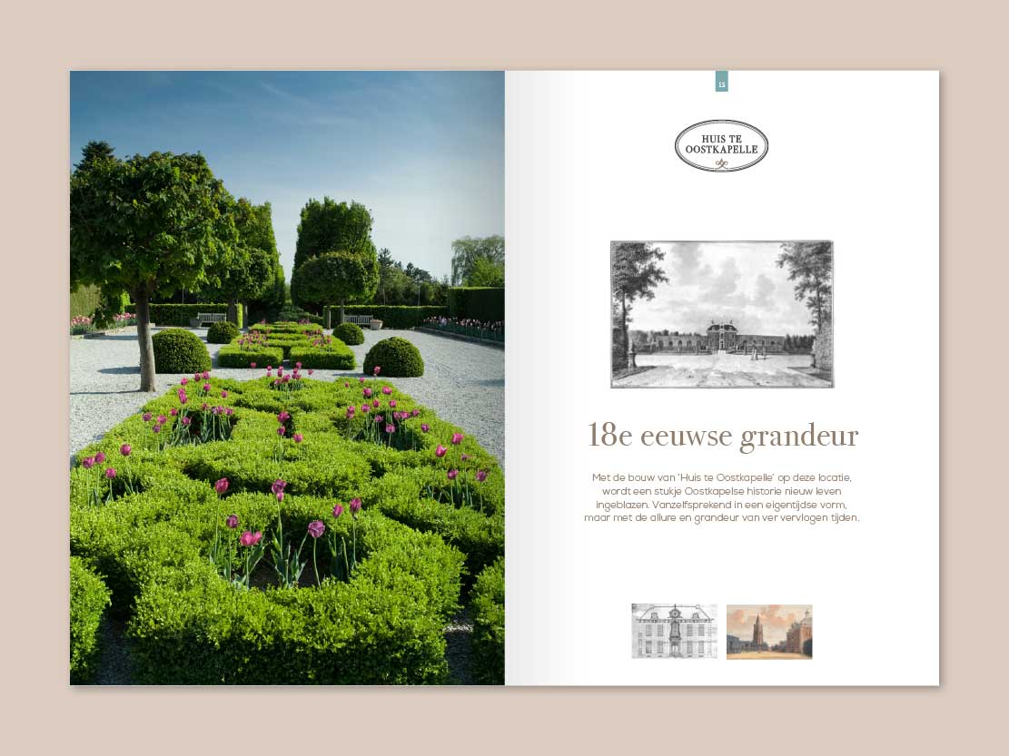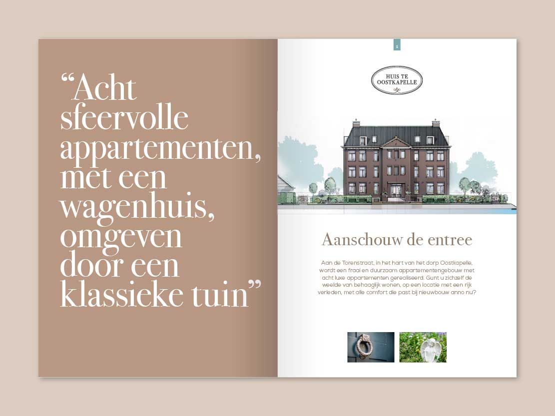 In het Zeeuwse Oostkapelle bouwt Estuarium Vastgoed 8 luxe, klassieke en duurzame appartementen. Met de bouw van ‘Huis te Oostkapelle’ op deze locatie, wordt een stukje Oostkapelse historie nieuw leven ingeblazen. Vanzelfsprekend in een eigentijdse vorm, maar met de allure en grandeur van ver vervlogen tijden; 18e eeuwse grandeur in een nieuw jasje. Voor dit nieuwbouwproject heb ik een bijpassend logo en concept ontwikkeld, dat allemaal samenkomt in een luxe boek.
