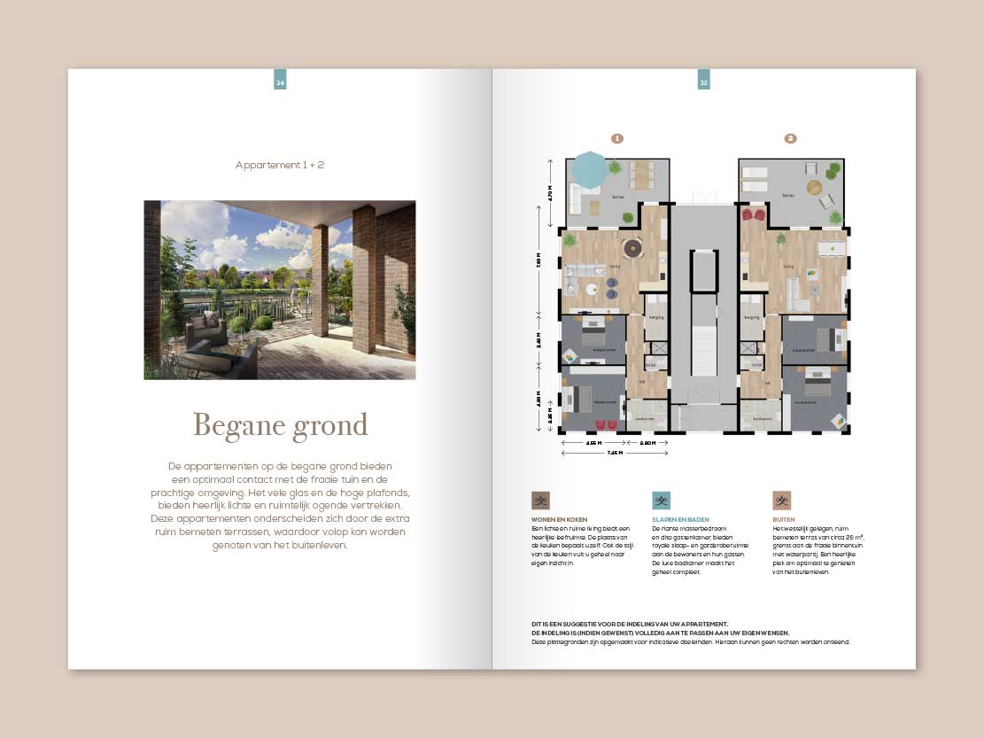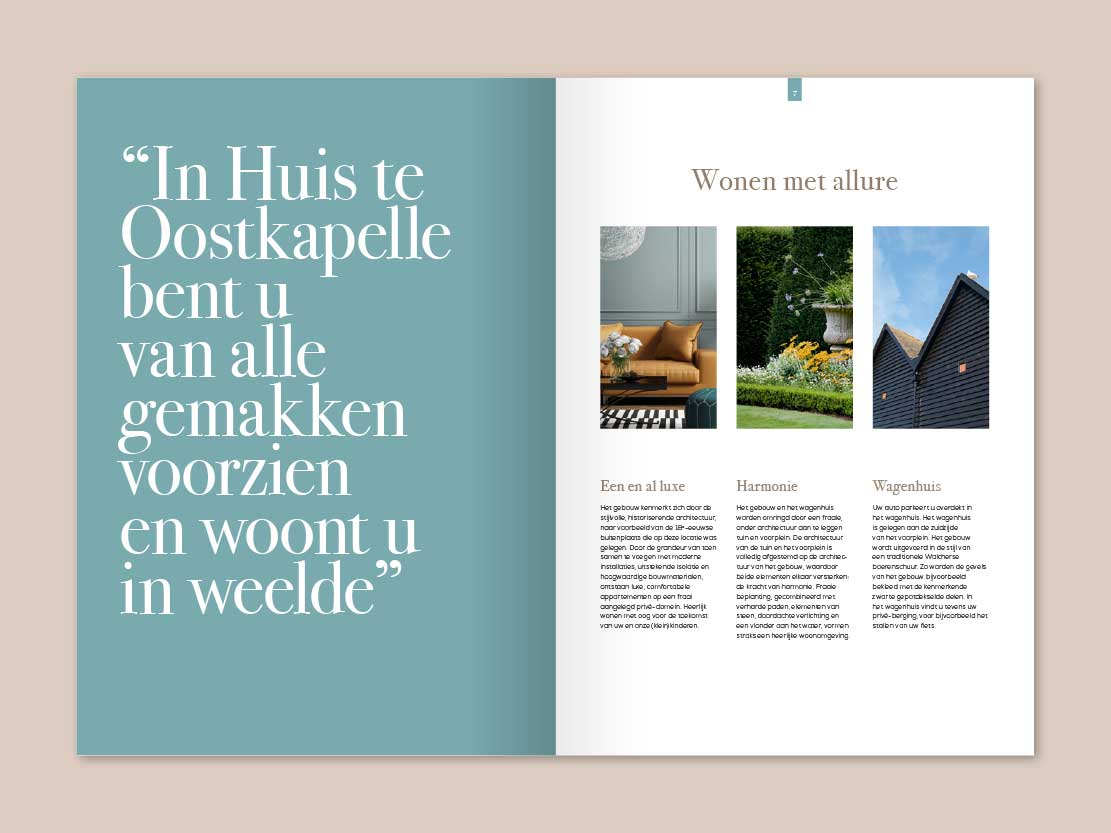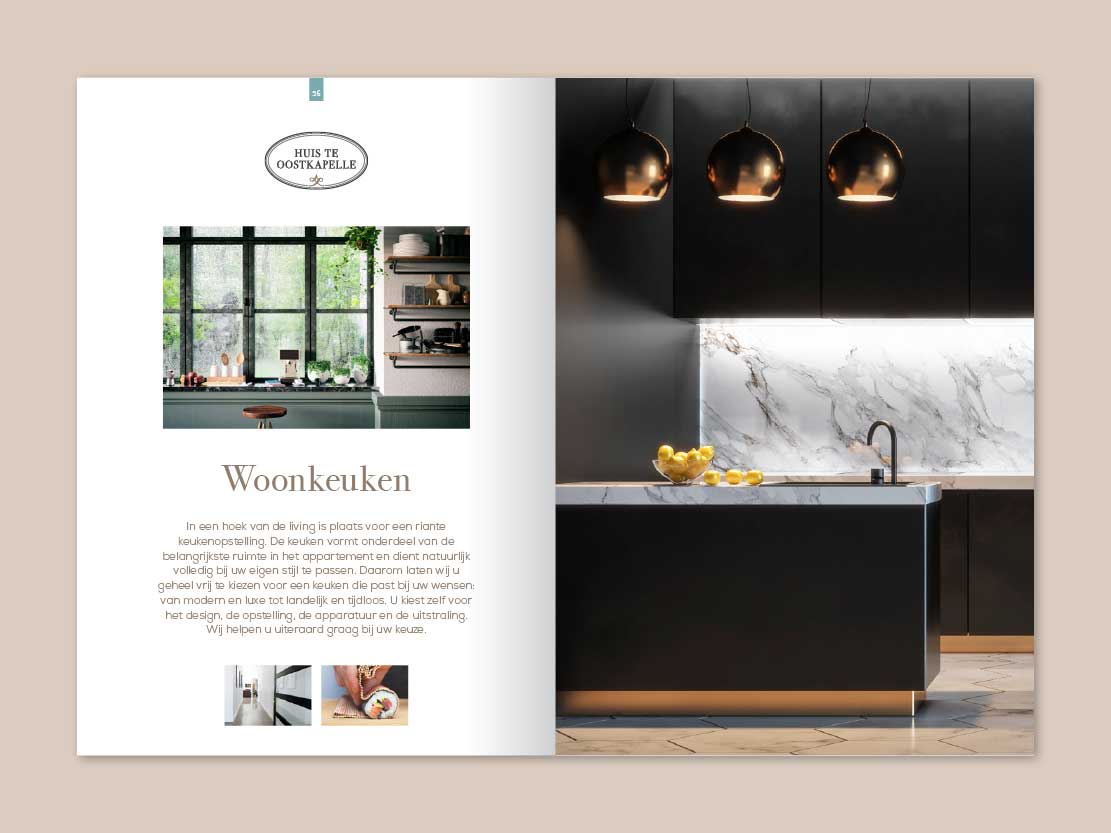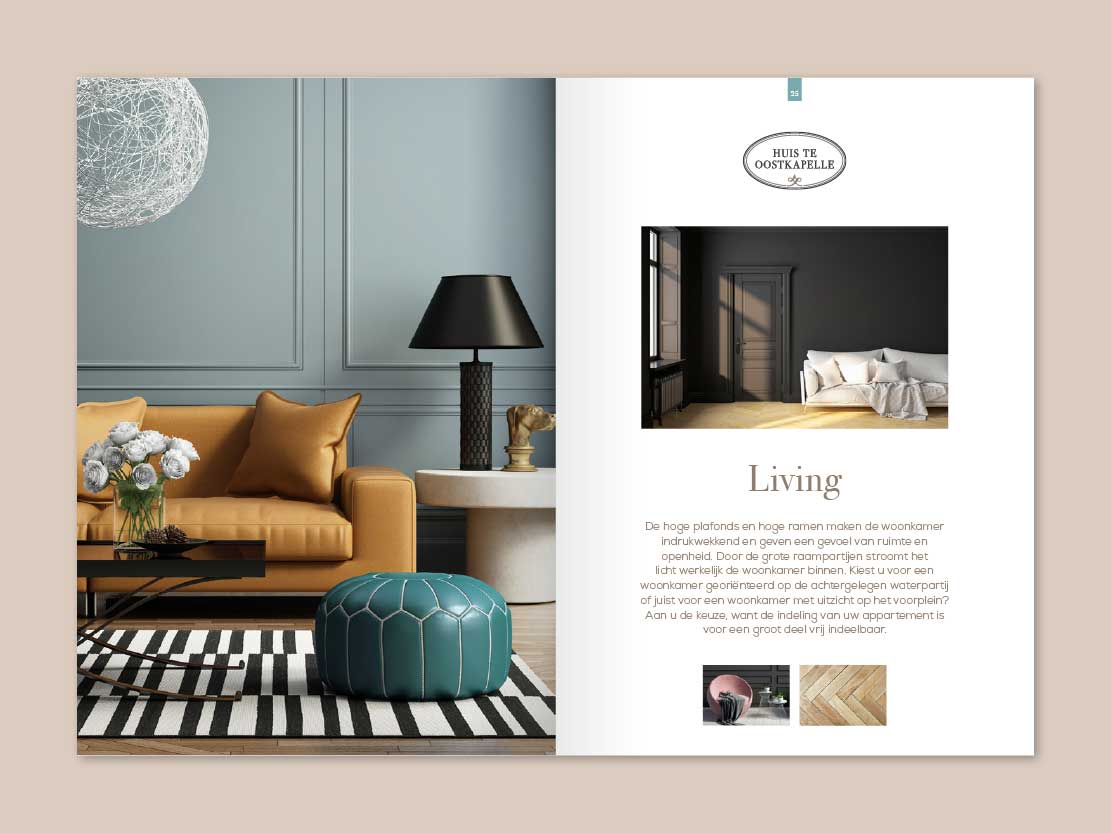 De luxe die dit project uitstraalt moet natuurlijk ook in het verkoopboek goed naar voren komen. Nu hadden we voor dit vastgoedproject al genoeg mooie AI’s (Artist Impressions) en deze heb ik aangevuld met passende (stock)fotografie.