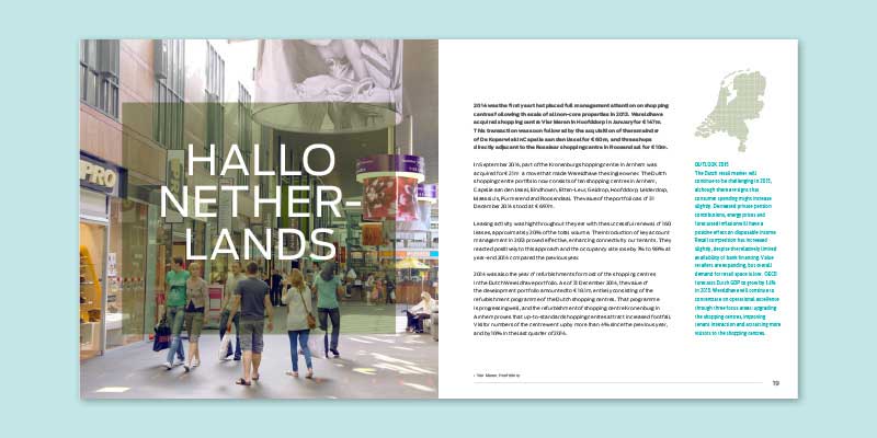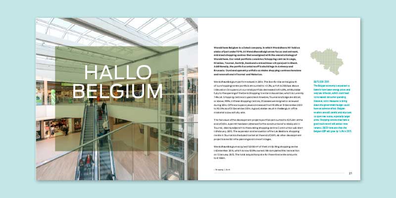 Voor Wereldhave heb ik het Sustainable Business Report ontworpen in de huisstijl van de multinational destijds. In het rapport communiceren we alles volgens de richtlijnen van