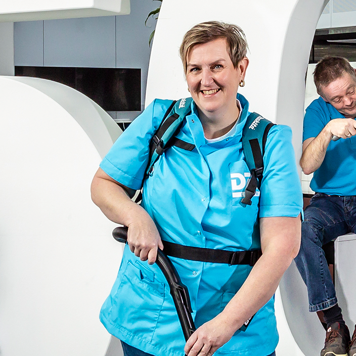 “Ik heb dit werk niet altijd gedaan. Ik heb in de kraamzorg en heel lang bij een dansschool gewerkt. DZB was voor mij een nieuwe uitdaging op het juiste moment. Het leek mij wel wat om als voorvrouw collega’s te helpen bij hun ontwikkeling. Om mensen goed te kunnen begeleiden moet je ze eerst goed leren kennen. Met een nieuw iemand bouw ik de werkzaamheden langzaam op. Niet te hard van stapel lopen en eerst maar eens de basis leren. En vergis je niet, bij schoonmaakwerk komt meer kijken dan je denkt. Het is heel anders dan hoe de meeste mensen het thuis doen.”